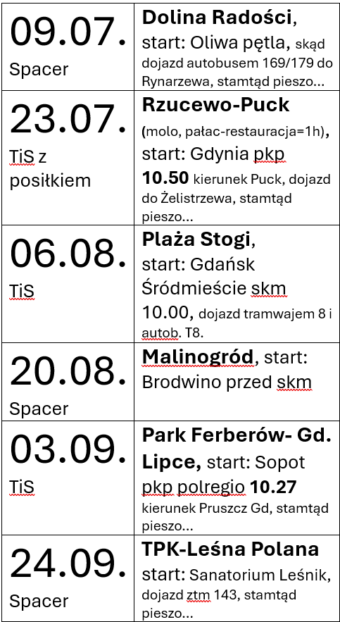 Na koniec roku akademickiego udostępnione zostały ankiety, których celem było ustalenie programu i zainteresowania formami turystyki wakacyjnej: spacery S (ok 3-4 godz) oraz wycieczki TIS (tam i spowrotem ok 6-8 godz). Wypełnione ankiety (do dnia 20 czerwca) ostatecznie złożyło 46 osób, tym samym decydując o programie. Ze względu na wymogi organizacyjne (rezerwacja, zgłoszenie, kalkulacja kosztów, zawiadomienie, bezpośredni kontakt) realizowany będzie poniższy grafik wycieczek: